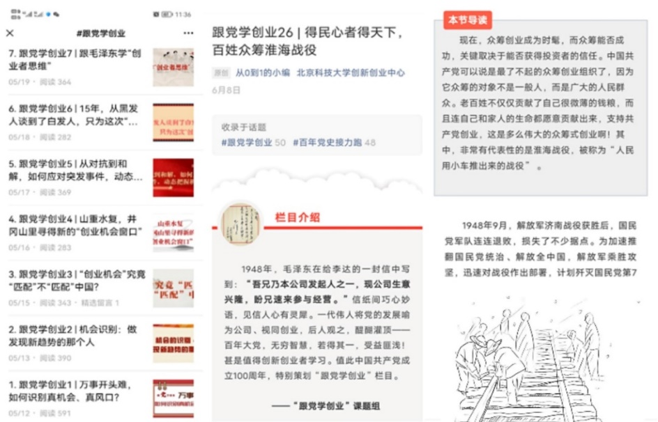 课程学习之外,工作室每天以“案例+漫画”模式在公众号“创新创业中心”与“北科大青年”上同步推送“跟党学创业”原创文章,拓展授课内容,帮助学生巩固学习成果。